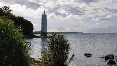 Hier kurz hinter der Ortsmitte haben wir die Möglichkeit, zum Leuchtfeuer Neuhagen zu fahren. Der Weg ist eine Sackgasse, der Turm in der Dämmerung ein beliebtes Fotomotiv.